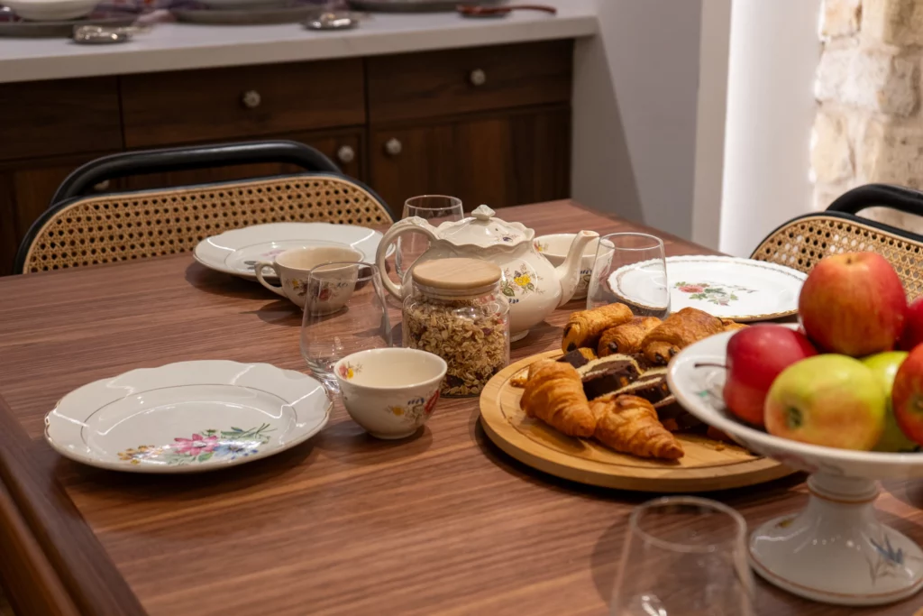 Each morning, breakfast is complimentary with any direct booking. A large shared table, carefully selected products, good coffee, and conversations that slowly unfold.